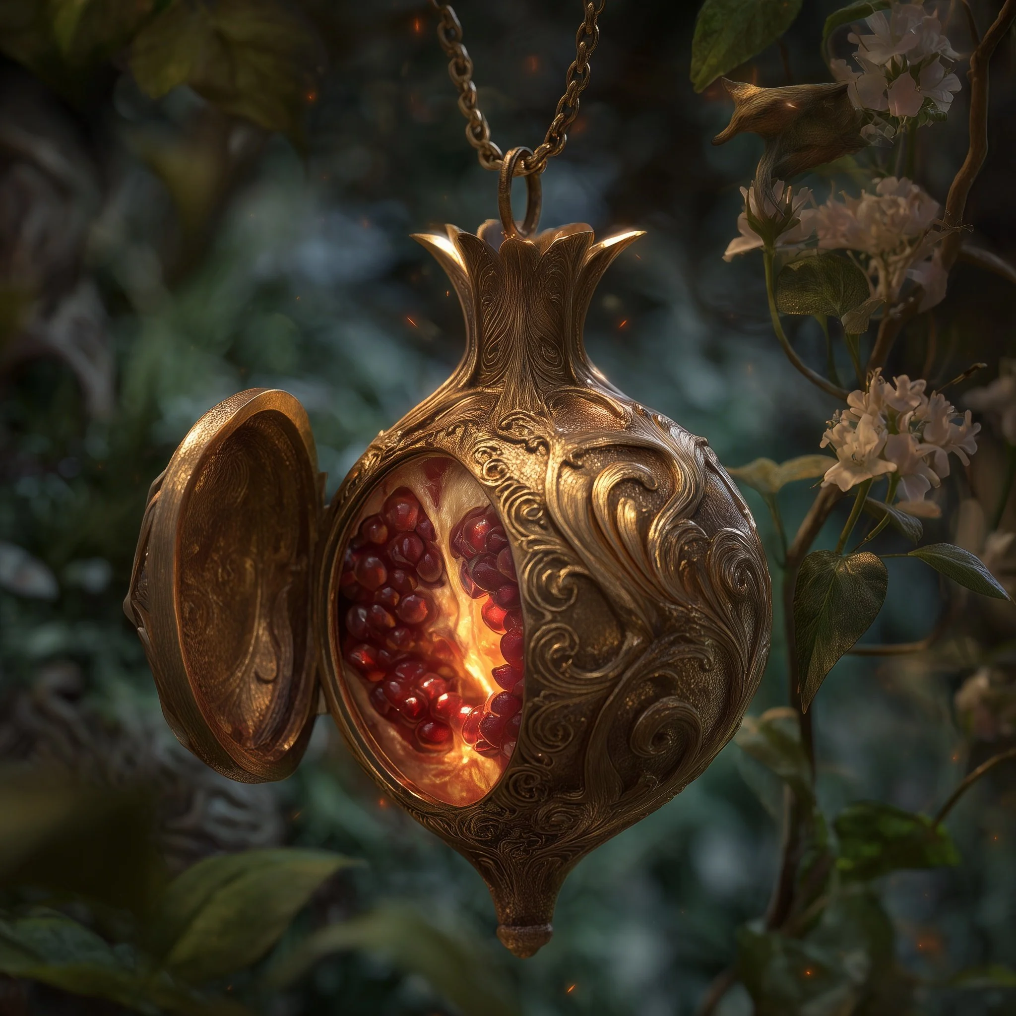Persephone is the radiant goddess of spring and flowering growth, whose youthful innocence and boundless curiosity exist within the protective confines of her mother Demeter's watchful embrace. With pomegranate-red hair crowned in seasonal blooms and fingers that coax gardens into instant life, she possesses an artist's mastery over flora yet yearns for domains beyond meadows and sunshine, her fascination with forbidden concepts like death and passion revealing a spirit increasingly restless with her sheltered existence. Though she radiates the pure vitality of new growth and moves through Olympus leaving flowers blooming in her wake, the golden Pomegranate of Protection pendant at her throat serves as both safeguard and symbol of her confinement, a constant reminder of boundaries she grows more eager to transgress.